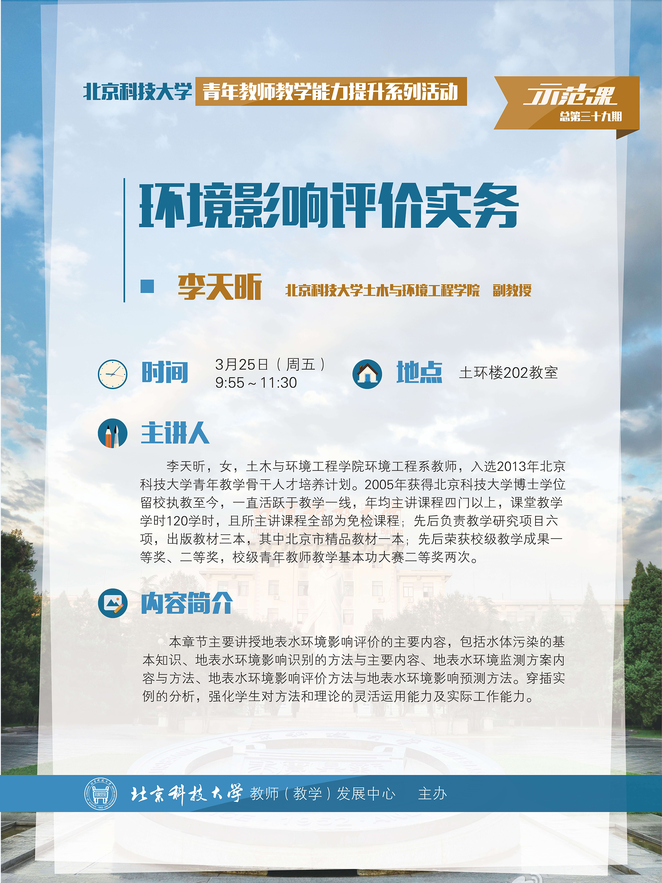 第四周周五(3月25日)第二大节(9:55开始)在土环楼202教室由土木与环境工程学院李天昕老师为大家带来《环境影响评价实务》示范课,本章节主要讲授地表水环境影响评价的主要内容,包括水体污染的基本知识、地表水环境影响识别的方法与主要内容、地表水环境监测方案内容与方法、地表水环境影响评价方法与地表水环境影响预测方法。穿插实例的分析,强化学生对方法和理论的灵活运用能力及实际工作能力。