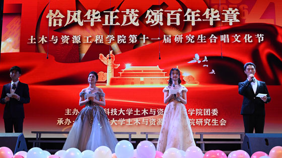 随后,晚会以研究生班级为单位依次进行竞演,分为歌曲合唱和风采展示两个环节,此次共有10个班级参赛。合唱上半场分别是土木硕2102班、矿加硕2105班、采矿硕2107班、安全硕2108班以及地矿硕2106班带来合唱歌曲和风采展示,师生们动情的演唱、丰富的演出,生动展现了新时代青年坚定的理想信念与深沉的爱国情怀,也蕴含着对祖国未来的美好祝愿。