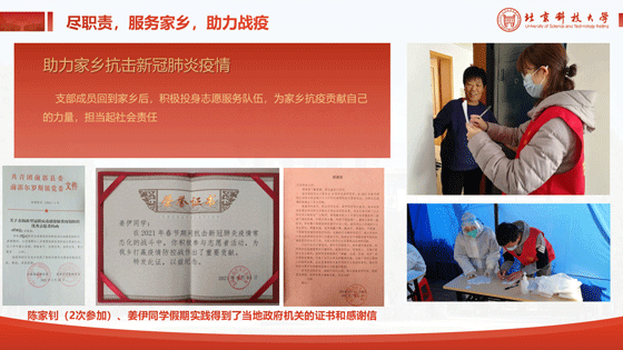 土本18党支部党支书张卓勋说提到,本18级党支部成员寒假在家乡积极投身志愿服务工作,为抗疫贡献力量,担当起社会责任,做出党员表率。其中陈家钊、姜伊同学在此期间表现优异,获得当地政府机关的证书和感谢信。