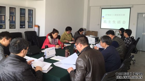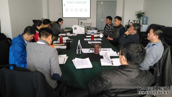 支部书记李正要首先介绍了学校党委对党支部召开“两学一做”专题民主生活会的要求,接着代表党支部总结了支部在矿物加工工程专业教育认证、矿业工程学科评估、组织党员教师开展“两学一做” 学习教育等方面的工作,剖析了支部工作中的不足之处,提出了支部今后的主要工作内容。支部每名党员以“四讲四有”为标尺,对照学校教师党员行为规范,结合2016年度工作和生活情况,依次进行批评与自我批评,反思了自身工作、学习、思想等方面存在的不足。党员同志积极发言,自我批评态度端正;与此同时,支部党员还相互批评、相互指正,对其他同志的优点给予肯定,缺点予以明确的指正说明;还结合实际,讨论了矿物加工工程学科发展、青年教师如何培养及如何提高教师幸福感等。会议气氛轻松、和谐,充分体现了党内民主,增强了党内同志间的交流。