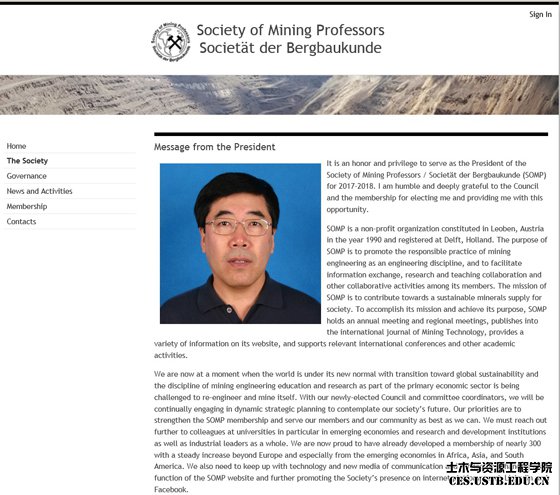 我校李仲学教授于2017年7月3日至6日在意大利举行的“国际矿业教授学会”(Society of Mining Professors, SOMP)第28届学术年会上,由先前当选的候任主席(President-Elect)正式确认为学会主席(President 2017-2018)。