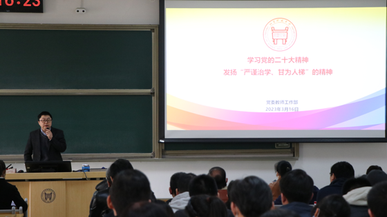 随后,党委教师工作部部长董春阳在逸夫楼205为全院教职工开展了题为“学习党的二十大精神 发扬‘严谨治学、甘为人梯’的精神”的专题讲座,作为必赢nn699net官网本学期理论学习的开学第一讲。董春阳从学习领会党的二十大精神、习近平总书记关于教育的重要论述和习近平总书记给我校老教授重要回信精神、全面贯彻《新时代高校教师职业行为十项准则》文件精神等方面,详细阐述了加强师德师风建设的重要意义和主要内涵,通过解读十项负面清单,强调十一个“不得”,对师德师风建设提出了具体要求。教育大计,教师为本;队伍建设,师德为先。培养优良的师德师风是造就和建设教师队伍,促进教师专业成长的首要任务。要坚持以习近平新时代中国特色社会主义思想为指导,深入学习领会党的二十大精神,认真践行《新时代高校教师职业行为十项准则》,立足学校“双一流”建设和“十四五”规划总体部署,将“严谨治学、甘为人梯” 内化于心、外化于行,努力成为学生为学、为事、为人的“大先生”,以优良的工作作风和出色的工作成绩,推动学院工作再上新台阶。