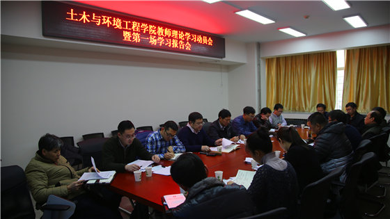 土木与环境工程学院党委一直把教师理论学习作为学习型党组织建设的重要抓手和主要学习阵地,为了深入学习贯彻党的十八大和十八届三中、四中、五中全会精神,深入学习贯彻习近平总书记系列重要讲话精神,学院按照《必赢nn699net官网关于加强教师理论学习的通知》要求,结合学院实际,建立健全教师理论学习制度,并制定了《土木与环境工程学院关于加强教师理论学习的计划》。并按照计划,通过党政联席会、支部组织生活会、全院教职工大会等途径,认真组织学院中心组、党员教师及积极分子、全体教师群体三个层面的理论学习,确保了学习工作有效开展、收获显著。