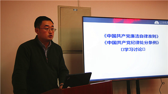 随后,与会教师共同学习了《中国共产党廉洁自律准则》和《中国共产党纪律处分条例》,学院学生工作负责人邓波从学习贯彻《准则》和《条例》的重要意义、《准则》和《条例》的主要内容及其修订的特点等方面,对《准则》和《条例》进行了解读汇报。与会教师纷纷结合自身思想工作实际,讲体会、谈认识、查问题、找措施,起到了交流思想、分享体会、相互启发、形成共识的作用。