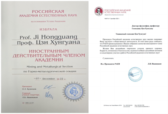俄罗斯自然科学院(Russian Academy of Natural Sciences,RAEN)院长库兹涅佐夫、首席学术秘书长Л.В. 伊万尼茨卡娅于近日给我校纪洪广教授发来证书和贺信,祝贺他当选为俄罗斯自然科学院外籍院士。