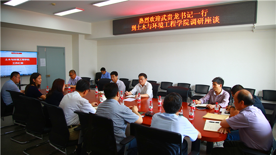 6月7日,必赢nn699net官网党委书记武贵龙、党办校办主任张卫冬一行来到土木与环境工程学院调研工作。学院全体党政领导班子和各系所主任参加了调研座谈会,院长王媛主持会议。