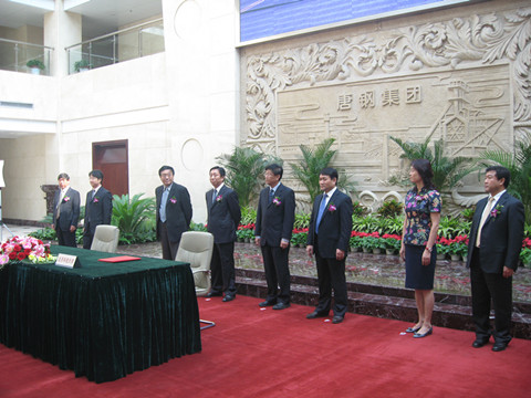 于勇董事长、徐金梧校长、陆致成总裁分别致词,和陆致成分别代表我校及同方股份有限公司与唐山钢铁集团有限公司代表苏福源在协议书文本上签字。三方将在烟气脱硫脱硝、焦炉烟尘、荒煤气资源化及煤调湿、钢渣余热回收、能源平衡综合利用、提高余热发电效率等技术领域以及能源环境实验基地等方面开展深入扎实的合作。