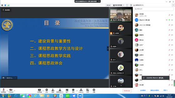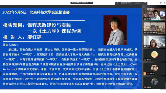 2022年5月5日下午,必赢nn699net官网教师发展中心举办名师讲堂活动,邀请国家级一流本科课程负责人、西安交通大学教授廖红建老师为全院教师开展了主题为“课程思政建设与实践——以《土力学》课程为例”的讲座。学院党委书记苗胜军教授、各系主任、教学主任等70余名教师参加,讲座由教学副院长刘洋教授主持。应疫情防控政策要求,本次讲座通过线上形式开展。
