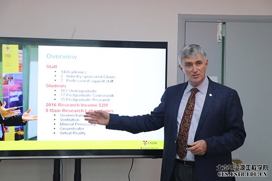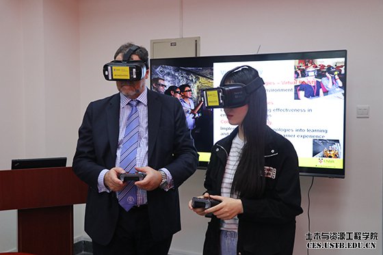 Paul Hagan院长介绍了新南威尔士大学和矿业工程学院的概况,以及采矿工程的学科发展。南威尔士大学是澳大利亚名校联盟“八大名校”之一,创立于1949年,其主校区位于新南威尔士州首府悉尼。在最新的“QS世界大学排名(2017-2018)”中,新南威尔士大学位居世界第45位,在2017QS世界大学专业排名中采矿工程位居世界第5位。Hitch教授随身带来了新南威尔士大学自主研发的金属矿VR眼镜,与师生进行了亲切的现场互动。