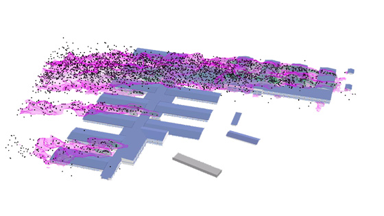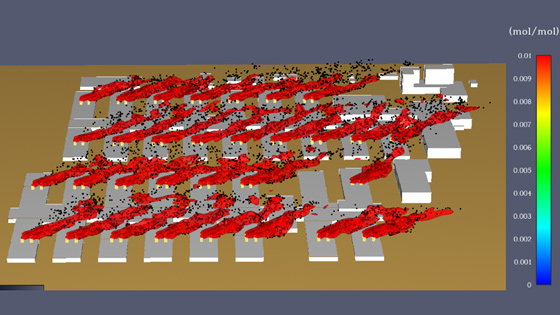 随后,联合攻关组配合火神山、雷神山医院工程进度要求,对医院周边区域室外有害气体浓度和分布进行了分析。联合攻关组以开源流体力学计算软件FDS为基础,实现了临时医院建筑的快速建模、基于云计算平台的高效计算、以及有害气体流动的监测和可视化,并验证了模拟方法的准确性,成功应用于武汉火神山、雷神山医院的室外有害气体排风设计(如下图所示),相关技术细节分别在线发表在我国科技期刊《工程力学》和《城市与减灾》上。