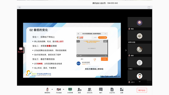 最后,胡老师向大家介绍了学校新的线上就业渠道、疫情期间就业手续办理的流程以及近期双选会信息,特别强调了学院网上双选会将在3月2日-4日举行,并针对应届生身份、企业待遇等学生关心的问题进行了耐心解答。