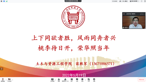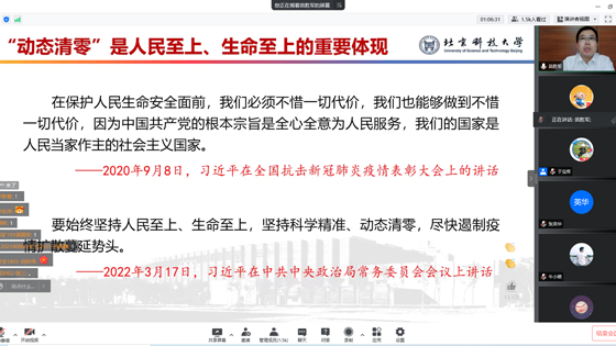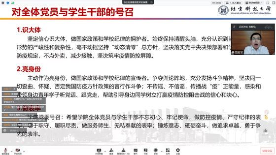 苗胜军由全国和北京市当前疫情发展情况出发,系统性地向同学们讲述为什么要毫不动摇地坚持和落实党中央提出的“动态清零”方针。苗胜军指出,当前首都高校面临的疫情防控挑战是前所未有的,高校的防疫工作也是整个首都防疫工作的重中之重,在这场疫情防控大考中,同学们要始终相信学校、学院是大家的坚强后盾,全体北科人、土资人要齐心抗疫,风雨同舟,迅速行动。