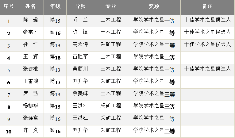 10月26日上午,必赢nn699net官网第十四届研究生学术之星的终选答辩在土木楼214会议室举行。学院副院长李长洪教授、党委副书记邓波老师、土木工程系主任苗胜军教授、副主任谭文辉老师、王涛老师、资源工程系王洪江教授、吕文生老师、付建新老师、建筑与能源环境工程系副主任宋洪庆教授、矿物加工工程系赵洪宇老师到场担任答辩评委。共有5名博士生、3名硕士生参加了本次学院学术之星终选答辩。