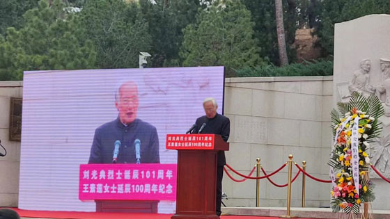 巍峨墓碑下,卓越功勋;青松绿柏中,英气凛然。今年是刘光典烈士诞辰101周年、王素莲女士诞辰100周年。在无名英雄纪念广场前,刘光典烈士的子女、贾雪阳少将、烈士AI数字形象制作团队负责人、有关历史研究机构专家老师、烈士家乡党支部代表和学生代表分别致辞,表达对以刘光典为代表的隐蔽战线烈士们的深切怀念与无限哀思,对祖国和平统一事业的信心和期盼。
