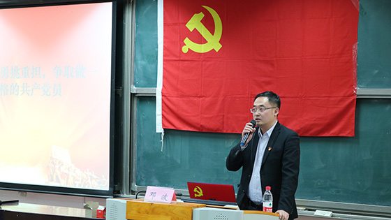 邓波首先对入党积极分子高昂的入党热情表示肯定,同时也提醒他们距离一名优秀的共产党员的道路还很漫长,还需不断地努力。他结合身边优秀共产党员事迹和自身工作经历,从三个方面讲述了如何坚定信念、勇挑重担、争取做一名合格的共产党员:一是树立正确入党动机,邓波通过对入党动机的类型的分析,引出了为什么要端正入党动机以及如何树立正确的入党动机的问题,同时强调了端正入党动机的重要性;二是以实际行动争取早日入党,他强调,入党积极分子应该做到“四个必须”,以实际行动端正入党动机,自觉接受党组织培养、教育和考察,从各方面积极向党组织靠拢;三是中央对青年的激励,通过习总书记对青年的殷切希望,他对积极分子提出了要坚定信念、勇于担当的要求。