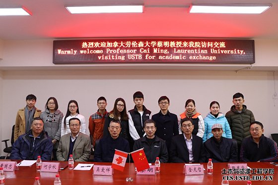 会议开始,蔡明教授介绍了加拿大劳伦森大学和所属研究所,结合个人经历说明了当前的研究方向和团队规模,并表达了与我院开展技术合作,推广交流的意向。随后,吴爱祥校长向蔡教授简要介绍了北科大及我院的专业背景,提出国际化的发展目标,希望能够与蔡教授的团队和劳伦森大学达成实质性的合作。金龙哲书记和安全系主任张英华教授在发言中对安全工程系的发展历史、办学情况、科研成果及主要研究方向进行了详细的介绍,再次表达了合作的愿望,并提出了诸多可能的合作路线。会议在轻松交流的氛围中圆满结束。