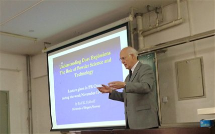 Rolf K. Eckhoff教授以《Understanding Dust Explosions The Role of Powder Science and Technology》为题,结合自己的研究,从粉尘的特性开讲,深入浅出,循序渐进,介绍了粉尘的不同特性对粉尘燃烧和爆炸的影响,并强调了对粉尘特性研究在粉尘爆炸预防和控制过程中的重要实践作用。随后Eckhoff教授又介绍了他在泄爆、隔爆以及防止粉尘二次爆炸方面的一些新研究和新方法。报告的最后,Eckhoff教授再次指出学好粉尘科学及技术是充分认识和妥善处理工业生产中粉尘爆炸的一个重要前提。