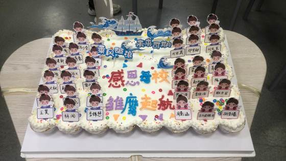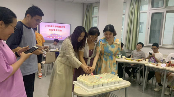 接着,李佳洁、牟欣丽和学生代表贾俊泽共同执刀,为同学们切分蛋糕。每个人都得到了专属小蛋糕,也代表着自己那份独特的本科四年生活。
